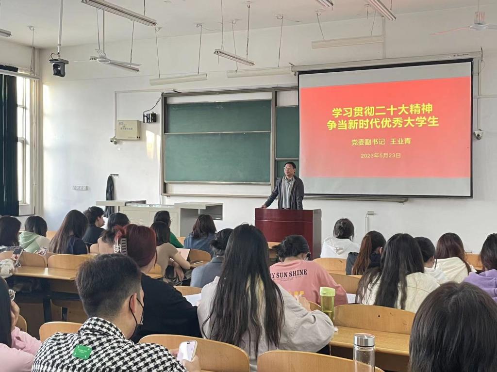 为深入开展学习贯彻习近平新时代中国特色社会主义思想主题教育,5月23日晚19点,外国语学院党委副书记王业青在鄠邑校区B203为外国语学院全体党员讲授“学习贯彻党的二十大精神,争当新时代优秀大学生”主题党课,全院100余名学生党员参加了此次党课学习。