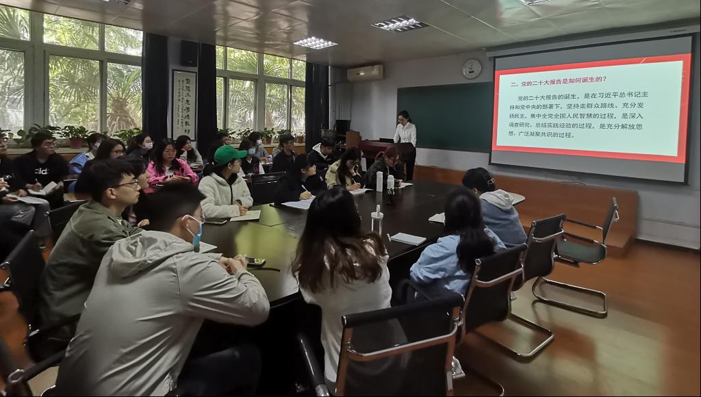 为深入学习宣传贯彻党的二十大精神,落实《中共bat365中文官方网站委员会关于认真学习宣传贯彻党的二十大精神的通知》,按照党委研究生工作部相关要求,4月26日上午,化学化工学院研究生在雁塔校区2号实验楼212会议室,开展学习党的二十大精神系列宣讲第一讲“学习党的二十大精神,谱写民族复兴新篇章”,党的二十大精神研究生宣讲团成员、化学化工学院研究生第四党支部书记尹兴雨同志担任主讲,活动由辅导员李超伟老师主持,化学化工学院研究生各党支部委员、党小组组长参加了会议。
