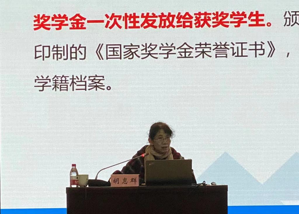 胡惠群从国家奖学金、国家励志奖学金、国家助学金、家庭经济困难学生认定、资助与育人五个方面展开培训,详细介绍了国家和陕西省相关资助政策,解读了各类奖助学金的申请、评审、发放等重点工作环节。她强调,要将资助与育人相结合,坚持为党育人,为国育才。要全面贯彻党的教育方针,落实立德树人的根本任务,注重“扶贫与扶志、扶智相结合”,引导困难学生自立自强、全面发展、成长成才。与此同时,她还鼓励bat365学工干部创新育人形式,建设和谐温暖资助氛围,为国家培养更多的建设人才。