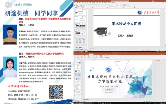 2022年12月23日王赵诚同学以“大型石化生产装置结构-设备耦合体系抗震性能研究”为题,提出耦合体系的抗震性能分析和评价理论。柳梅梅同学以“推靠式旋转导向钻井工具力学性能研究”为题,对导向工具轴承系统的负荷特性和摩擦磨损特性做了进一步的分析。