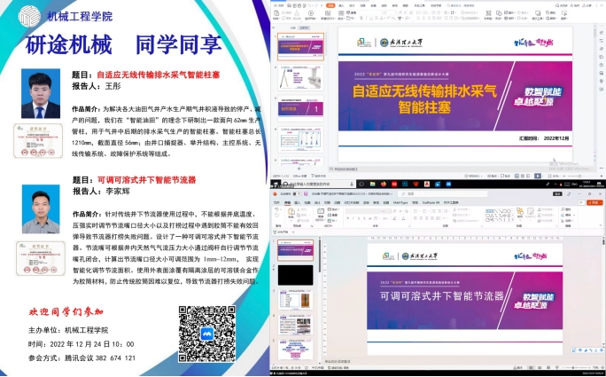 2022年12月21日郑桓同学以“难加工材料深孔内轮廓加工技术”为题,通过理论分析和加工试验验证了该加工刀具及其加工系统的可行性。陈浩宇同学以“基于机器学习的油气管道冲蚀预测究”为题,讲解了研究不同机器学习算法对管道冲蚀预测的可行性。