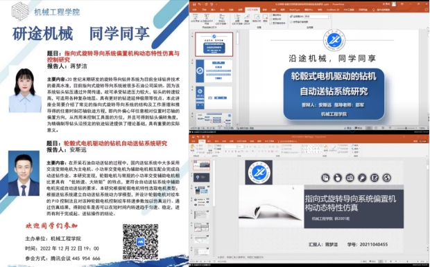 2022年12月22日蒋梦洁同学以“指向式旋转导向系统偏置机构动态特性仿真与控制研究”为题,介绍了常见的指向式旋转导向系统的结构及工作原理和推导得的任意时刻芯轴轨迹方程。安斯远同学以“轮毂式电机驱动的钻机自动送钻系统研究”为题,介绍了通过仿真结果来判断绞车是否可以在短时间内转速趋于匀速、稳定,进而有利于完成起、送钻操作。