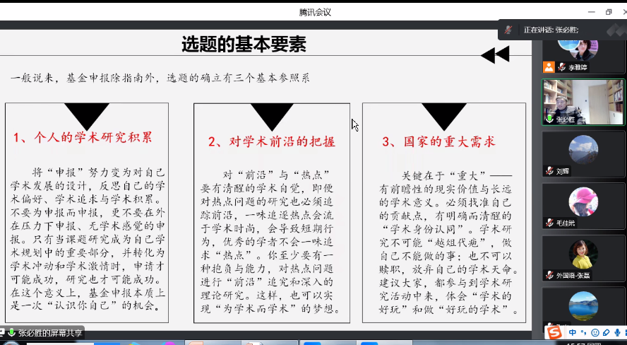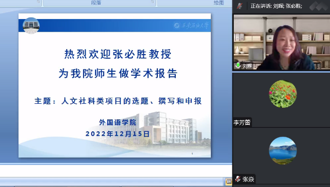为进一步做好人文社科基金项目申报组织工作,提高国家社科基金项目及其他基金项目的申报质量,外国语学院于12月15日下午15:30,特别邀请贵州师范大学教授、博士生导师张必胜教授开展了题为“人文社科类项目的选题、撰写和发表”的线上专题讲座。外国语学院全体教师、全体翻译硕士研究生共200余人在线参加了本次讲座,讲座由刘辉副院长主持。