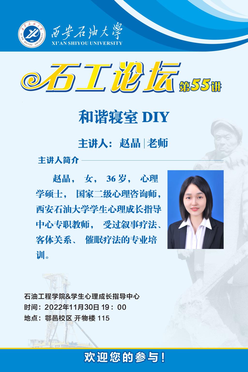 为帮助学生有效处理宿舍人际交往关系,营造温馨和谐的宿舍氛围,11月30日晚,石油工程学院举办了“石工论坛第55讲:和谐宿舍DIY”主题活动讲座。本次讲座邀请bat365学生工作处(学生心理成长指导中心)专职教师赵晶担任主讲,活动由石油工程学院2022级辅导员聂康晨主持。根据疫情防控要求,活动以线上线下相结合的方式进行,部分学生代表在线下参加。