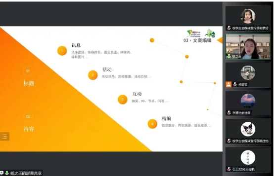杨之玉以《团属新媒体平台编辑与策划》为题,从思维导向、内容策划、文案编辑、实用工具等四个方面向大家讲述了做好团属新媒体的要求与方式方法,指出从事新媒体工作需要具备积累、胆大、心细三个要素,特别是要在日常学习与工作中积累丰富素材,勇于实践,为新媒体创作提供坚实保障。最后,针对同学们关心的话题选取、文字撰写、设计制作、图片选用、美编排版等方面的问题进行了详细的解答。整个讲座过程中同学们认真聆听,积极在评论区与老师互动,培训过程气氛热烈。