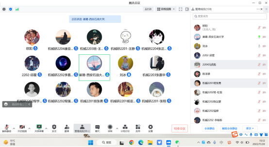 在全体研一学生线上座谈会上,学院副院长崔璐教授在听取同学们各类意见建议之后,重点强调了科研激励、成长规划、规矩意识三个方面。崔教授鼓励同学们进行学术型研究,积极参加各项学科竞赛,遇到问题及时与老师沟通,提高自身的科研能力。在成长规划方面,要求同学合理规划学习和生活,明确自身目标与方向,坚定信念,过一个充实的校园生活;崔教授强调,当下西安疫情严重,对于一些同学的焦虑与烦躁情绪表示理解,同时也希望各位同学务必配合相关防疫政策与要求,积极响应学校各方面的工作,培养自身规矩意识,存在问题及时反映,为疫情的好转贡献力量。