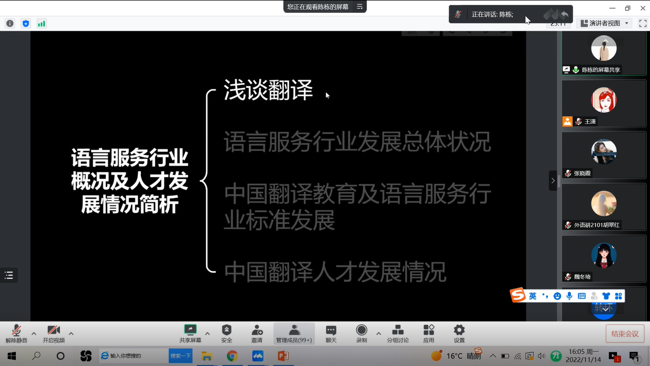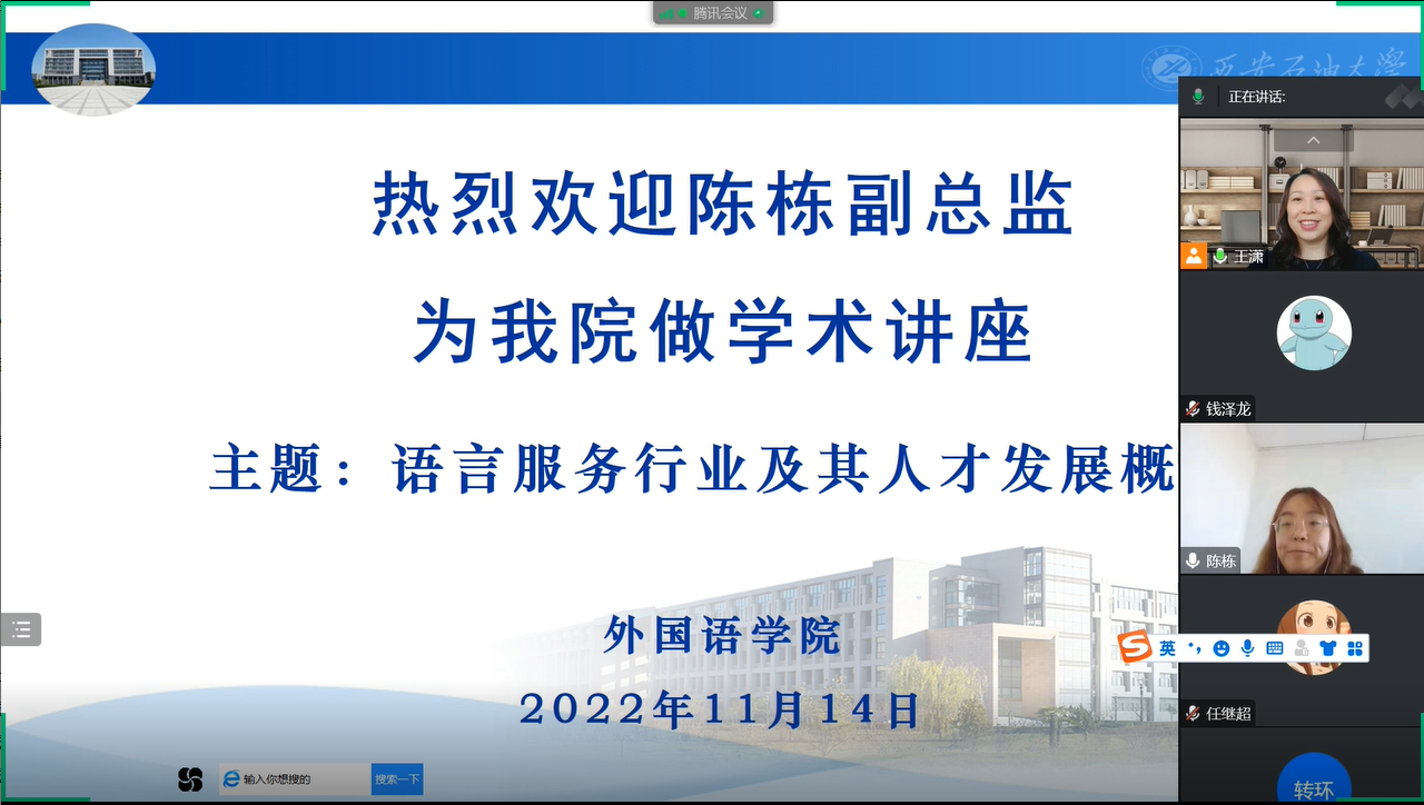 为进一步做好2023届毕业生就业创业工作,加强学生就业指导,强化就业育人实效,提高翻译硕士研究生的职业素养,帮助学生了解语言服务行业的基本现状,引导学生从实际出发选择职业和岗位,做好职业规划。11月14日下午,外国语学院邀请中译语通(陕西)科技有限公司语言服务事业群陈栋副总监,为bat365MTI全体研究生作题为“语言服务行业及其发展概况”的线上专题讲座。外国语学院MTI全体研究生100余人参加讲座,讲座由副院长刘辉主持。