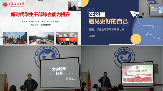 校团委副书记孙浩哲,干事李政、王泽文,分别以《新时代学生干部综合能力的提升》《学生干部沟通交流的技巧》《在这里,遇见更好的自己》为题进行了讲解。优秀学生代表姬祥飞、王志超和李纪新,分别结合自身学习工作、科技创新、社会实践、志愿服务等方面进行了交流与分享。