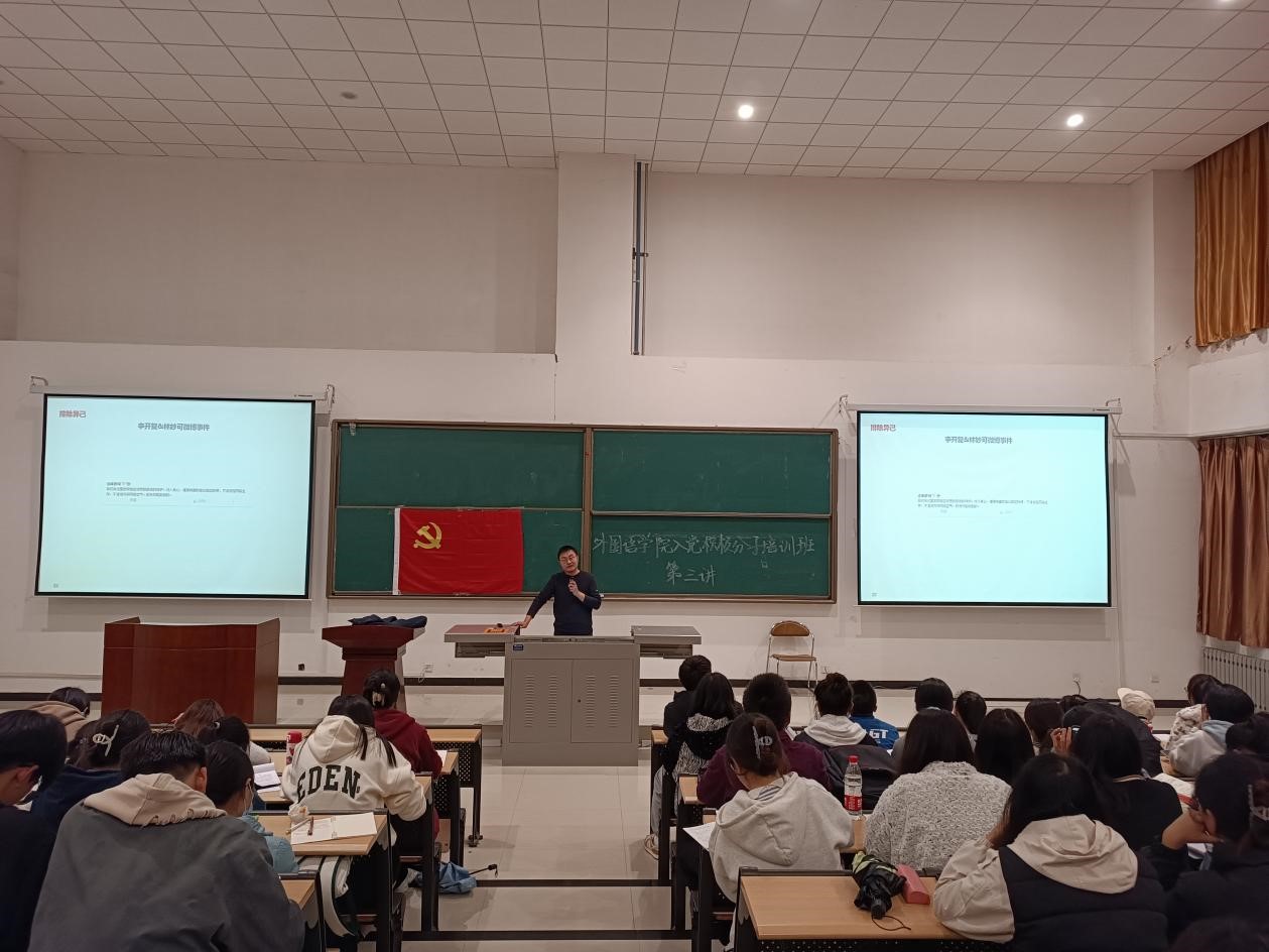 为进一步提升学院入党积极分子的理论素养、思想觉悟,聚焦青年思想,引导青年骨干坚定信念跟党走,勇做走在新时代、新征程上的奋进者。11月10日,外国语学院在鄠邑校区石工地科楼115教室举行第十一期入党积极分子培训班第三次集中授课。校团委书记何国强为2022年入党积极分子授课。