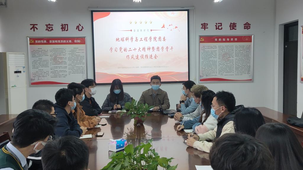 11月3日下午,地球科学与工程学院团委在开物楼507会议室召开学习党的二十大精神暨团学骨干作风建设推进会。学生会指导老师李佩琦、2019级团总支书记刘学斌、2022级团总支书记姜英哲、全体团学骨干、各班团支部书记代表参加会议,会议由2021级团总支书记刘宇航主持。