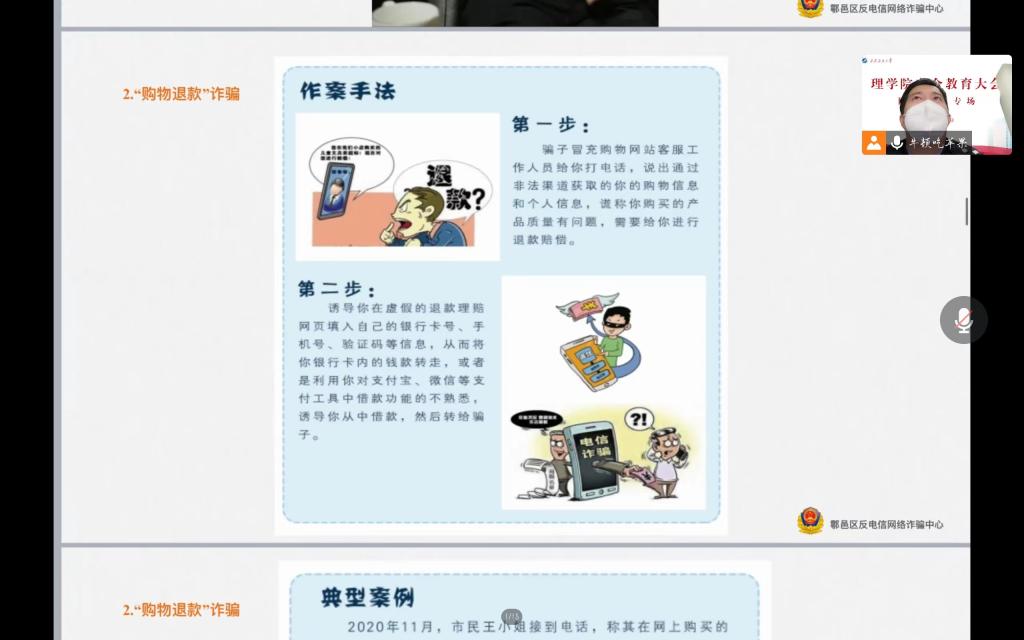 为提高学生安全意识,维护学生人身和财产安全,10月17日晚,理学院在线举办了预防电信诈骗专题安全教育大会。大会邀请鄠邑区沣京派出所郑昊警官进行宣传教育,理学院学工办主任丁亦喆主持,各年级辅导员全程参与。理学院600余名本、硕学生分三个会议室参会学习。