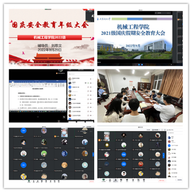 为切实做好国庆假期学生的安全教育、管理服务相关工作,根据《关于做好国庆假期有关工作的通知》(学工函〔2022〕22 号)和《关于做好国庆假期有关工作的通知》(西石大研工函〔2022〕22 号)的相关工作安排,结合疫情防控要求,9月29日至30日,机械工程学院本科生和研究生分年级分校区通过线上+线下相结合的方式开展学生干部、年级大会等国庆节假期安全教育工作。