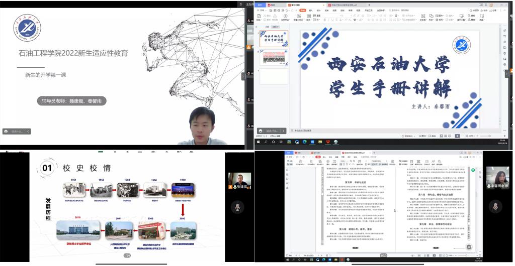 院系入学教育主要包含新生专业教育,新生适应教育,石油、铁人精神教育等活动。新生适应性教育工作以线上报告会形式组织进行,会议由石油工程学院党委副书记张建高主持,2021级辅导员秦馨雨、2022级辅导员聂康晨联合参与。报告会围绕校史校情、校纪校规、校园安全、学风建设、校园生活五个方面详细展开。张建高老师表示,学习校史,参观“两馆”,目的是帮助新生了解学校发展历程和取得的辉煌成就,感受先贤在办学过程中不畏险阻、砥砺奋进的办学精神,培养自身团结、勤奋、求是、创新的品格,践行好学力行、自强不息的校训。秦馨雨老师对《bat365中文官方网站学生手册》进行宣讲,使新生了解学校的各项规章制度,养成自觉遵守校规校纪的良好习惯;她从教学管理制度与学生管理制度角度出发,教育学生要做到诚实守信,鼓励其追求上进,争创优良学风。聂康晨老师结合政治、网络、饮食、出行、心理安全等多方面的典型案例,引导新生树立安全意识,养成良好的行为习惯,以减少校园不稳定的因素,保障自身身心健康。会上新生积极与老师互动交流,教育效果良好。