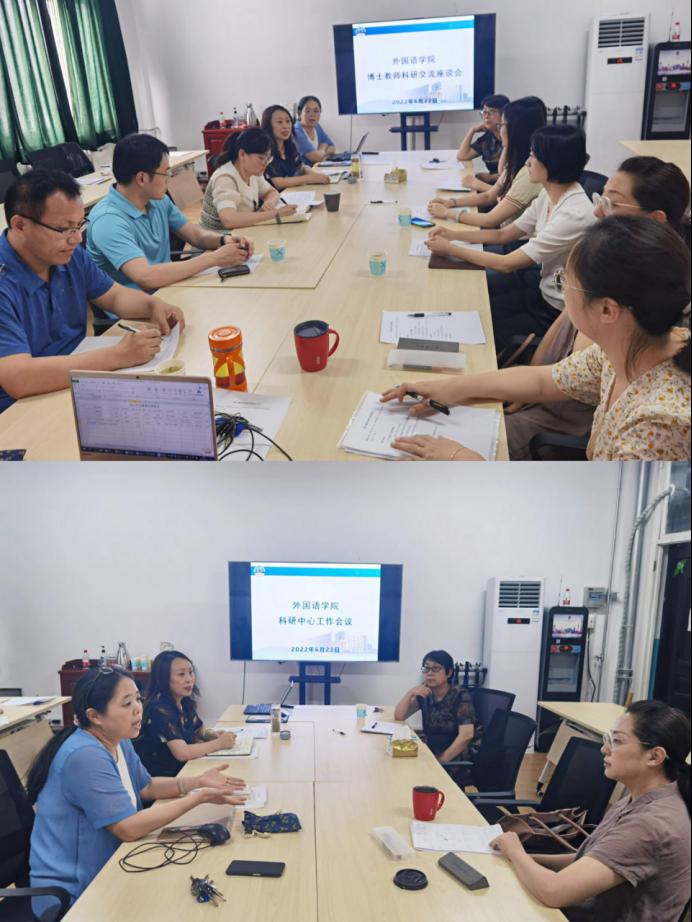 为推进学院科研工作,外国语学院于6月22日下午15:00在雁塔校区华油能源楼727会议室召开博士教师科研交流座谈会和科研中心负责人工作会议。院党委书记田虹霞、院长于艳英、学院博士教师及各科研中心负责人参加了会议。会议由副院长刘辉主持。