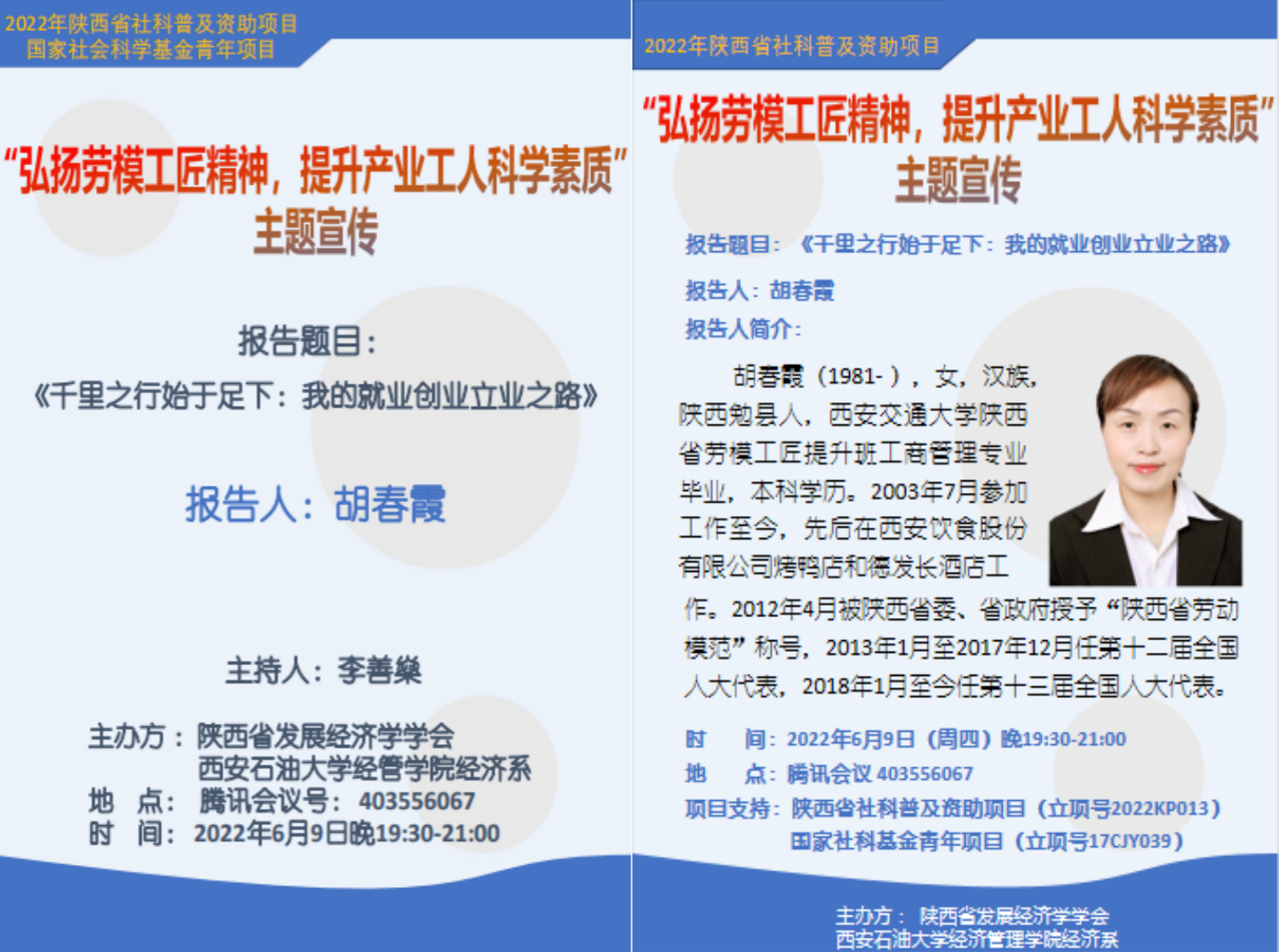 为全面贯彻落实习近平总书记关于科普和科学素质建设的重要论述,大力弘扬劳模精神、劳动精神、工匠精神,积极引领广大青年大学生在理论学习中、择业立业中、工作实践中,坚定理想信念和职业精神,6月9日,经济管理学院邀请第十三届全国人民代表大会代表、陕西省劳动模范胡春霞同志,以《千里之行始于足下:我的就业创业立业之路》为题,为学院青年大学生作线上专题宣讲报告,活动由学院经济系教师李善燊主持。