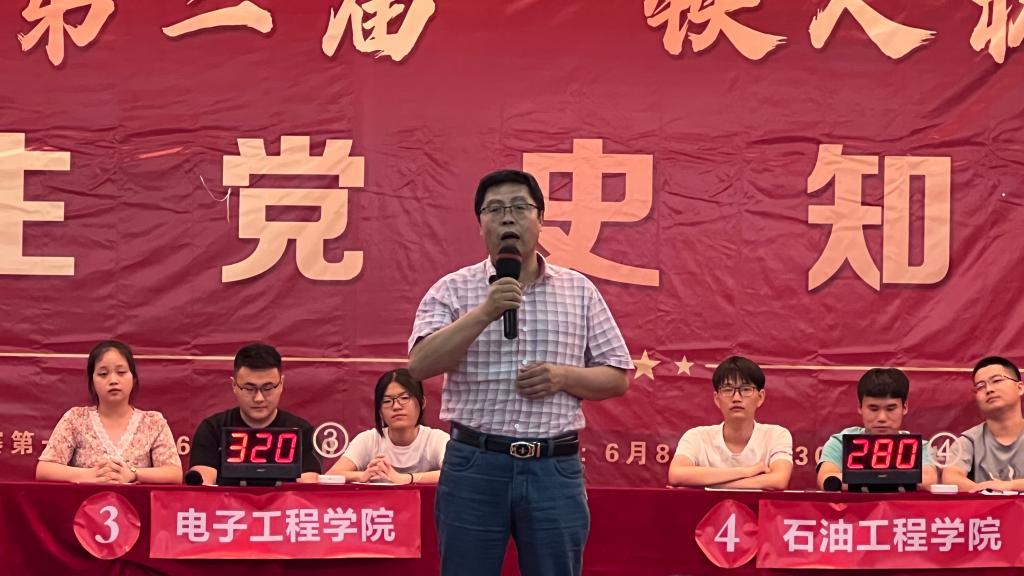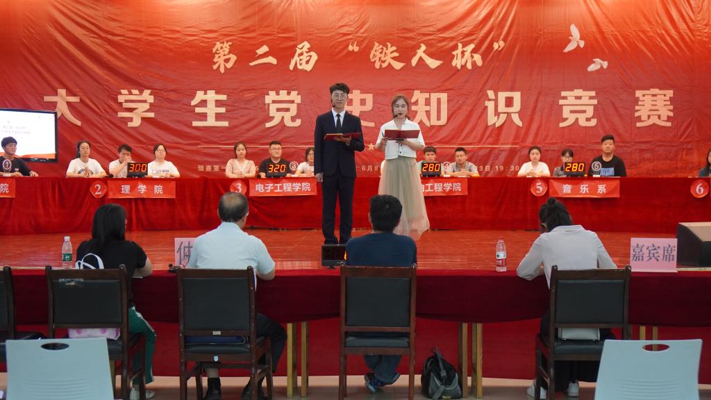 bat365十三个学院分别派出代表队参赛,通过前期抽签决定预赛顺序。预赛第一场参赛队伍包括经济管理学院、理学院、电子工程学院、石油工程学院、音乐系、计算机学院六支代表队。竞赛设置每人必答、每队必答、队员抢答、队伍抢答、勇攀高峰五个环节,竞赛题型分为必答题、抢答题、风险题三种题型,竞赛围绕党史、新中国史、改革开放史、社会主义发展史等内容开展,并特别增加了大庆精神(铁人精神)及bat365校史等相关内容。
