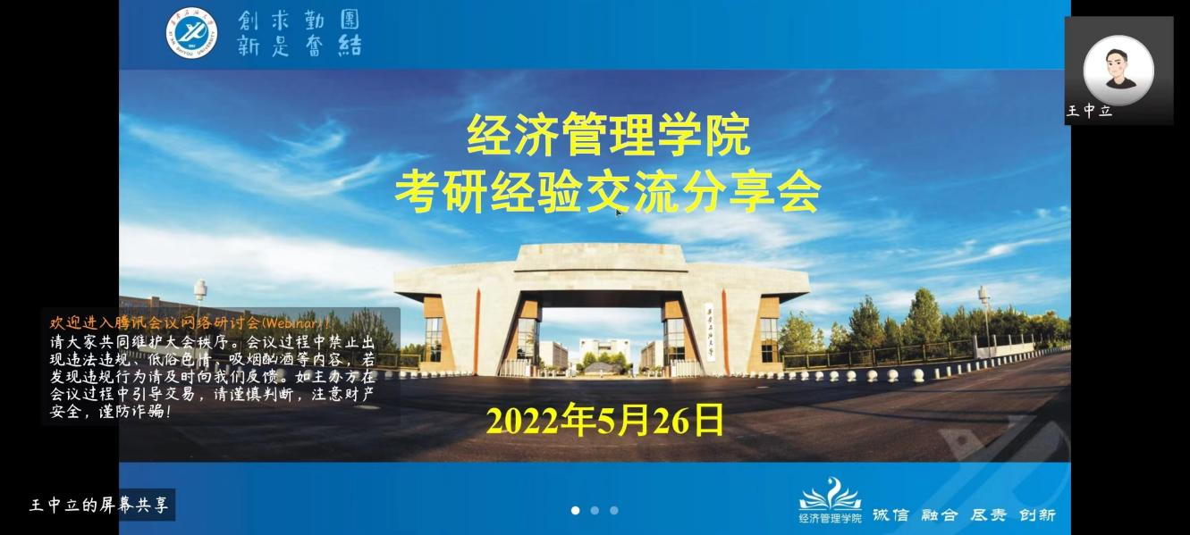 为拓宽学生未来规划发展视野,激发学生考研积极性与主动性,帮助学生树立明确目标、把握备考节奏、调整复习心态,经济管理学院于5月26日利用腾讯会议线上举办了“考研经验交流分享会”。本次会议邀请了被首都经济贸易大学、华东政法大学、英国南安普顿大学、美国克拉克大学等国内外知名院校录取的18位学院2018级优秀考研毕业生代表进行经验交流分享。学院2019级和2020级辅导员及学生代表参加会议,会议由辅导员王中立主持。