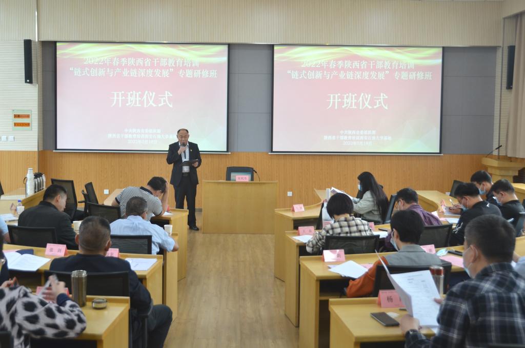 2022年5月18日上午,由省委组织部主办、bat365干训基地承办的2022年春季陕西省干部教育培训“链式创新与产业链深度发展”专题研修班,在bat365明德校区培训中心顺利开班。继续教育学院副院长吴民生出席开班仪式并致欢迎辞,来自省市党政机关的50余名领导干部参加了开班仪式。仪式由班主任康高梅子主持。