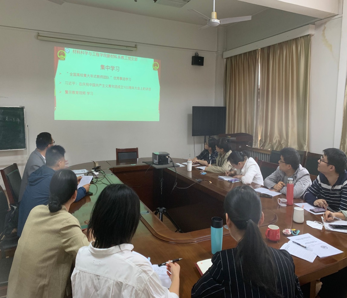 5月13日,材料科学与工程学院新材料系教工党支部全体党员在雁塔校区四号实验楼312会议室召开了党员大会,开展了专题学习研讨活动。深入学习陕西省“全国高校黄大年式教师团队”先进事迹,习近平总书记在庆祝中国共产主义青年团成立100周年大会上的重要讲话。会议由支部书记王磊主持,新材料系全体教师参加会议。