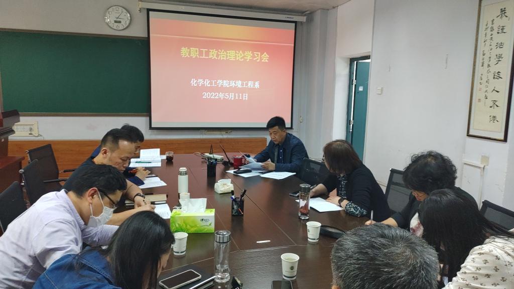 为更好贯彻落实《bat365中文官方网站教师政治理论学习制度》,发挥基层支部党建引领作用,结合学院党委关于做好巡视整改落实暨教育领域突出问题专项整治工作推进会的具体安排,5月11日下午,化学化工学院环境工程系在雁塔校区2号实验楼212会议室召开了全体党员、教师政治理论学习会。会议由环境工程系教工党支部书记屈撑囤主持,支部全体党员和环境系教师共14人参加了会议。