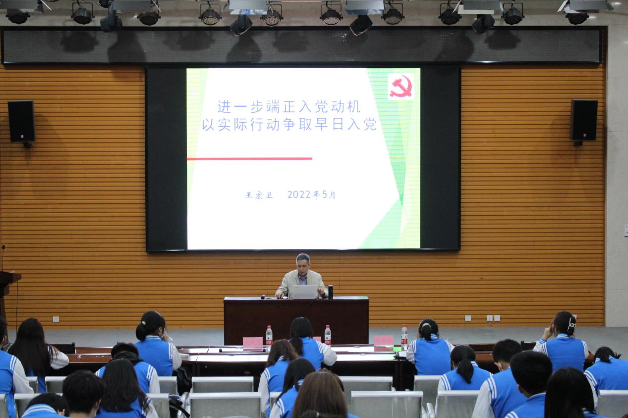 典礼结束后,经济管理学院党委书记王宏卫以“进一步端正入党动机,以实际行动争取早日入党”为题,为学员们讲授党课第一讲。他从中国共产党的性质和宗旨出发,紧扣新时代党的建设总要求,系统讲授了党章规定的党员条件和标准,全面阐述了新时代大学生端正入党动机的重要意义。强调正确的动机是入党的首要问题,是加强党性修养的终身课题,是保持党的先进性和纯洁性、推进全面从严治党向纵深发展的重要内容。作为入党积极分子要进一步端正入党动机,认真学习党的基本理论、基本路线、基本方略,以实际行动积极向党组织靠拢。他鼓励同学们要不断提高政治站位,坚定理想信念,坚守初心使命,立志成才报国,恪守清正廉洁,奋勇争先、当青春榜样,争取早日加入中国共产党。
