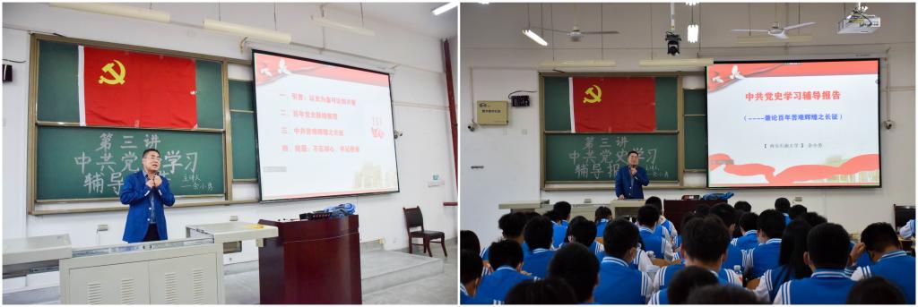 课堂上,余小勇老师围绕着“以史为鉴,可以知兴替”,“百年党史脉络梳理”“中共苦难辉煌之长征”以及“不忘初心、牢记使命”四个部分,阐述了学习党史的重大意义。通过对“新民主主义革命阶段,社会主义革命和建设阶段,改革开放和社会主义现代化建设阶段,中国特色社会主义新时代”这四个阶段的详细讲解,帮助同学们理清了中国共产党的历史发展脉络,进一步了解党的不懈奋斗史、党的理论探索史和党的自建史。