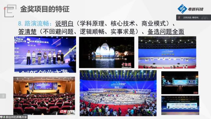 “好的项目要好好讲出来”,蔡老师以往年国家级金奖项目为例,为同学们总结了金奖项目的八大特征,帮助参赛团队准确完善自身项目,提升路演答辩技巧。