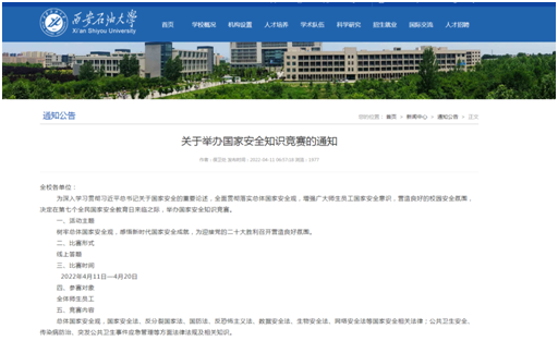 自4月11日起,国家安全教育日到来前,在疫情防控总体要求下,与校稳定办公室、党委学工部、党委研工部开展“国家安全知识竞赛”答题活动,积极组织全校广大师生员工参与线上答题活动,提升广大师生员工的国家安全意识。