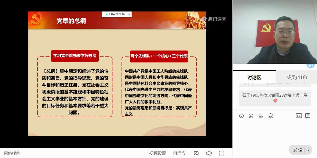 3月20日晚,石油工程学院第三十期入党积极分子培训班开班典礼暨第一讲,以线上“云课堂”的形式成功举办。学院党委副书记张建高、学生工作办公室主任朱战威及各级辅导员参加了活动。本次入党积极分子培训班由石油工程学院主办,各院系400余名学生共同参加了学习。
