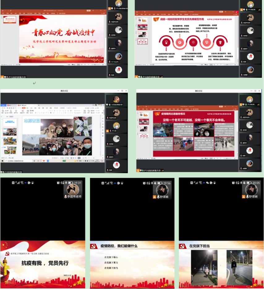 本次活动学院每个教工党支联系一个学生党支部,由教工党支部书记通过线上参加的形式列席研究生党支部组织生活会,并指导支部开展“三会一课”。在研究生支部组织生活会上每名党员同志都分享了近期封校以来自己的学习生活和工作情况,已经志愿参加学校疫情防控志愿服务活动的工作感受和面对本次疫情的个人心得体会。同时,支部党员分享了一些自己所学习到的先进事迹材料和大家进行了分享并汇报了个人的思想状态。