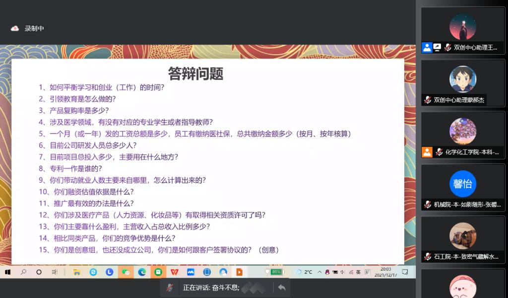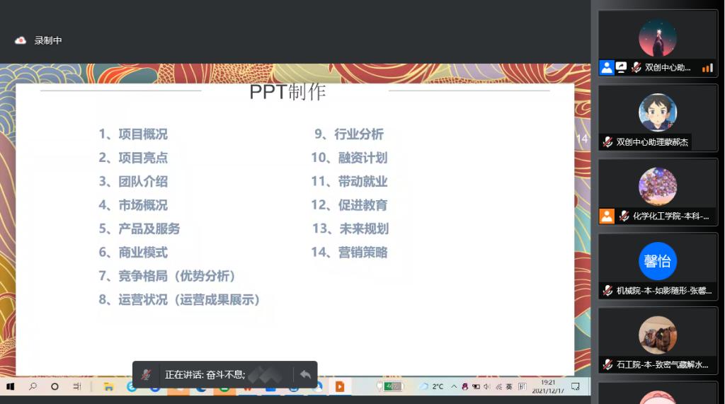12月17日晚,由创新创业中心主办的bat365中文官方网站2021年大学生创新创业训练营第八讲顺利开课。本次课程以《路演技巧和流程》为主题,训练营全体学员参加了本期课程。