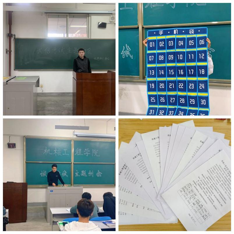 为切实做好疫情防控期间英语四六级考试、期末考试诚信教育工作,树立良好的学风、考风,确保学生安全、顺利参加考试,机械工程学院于12月9日-14日不间断开展考试诚信教育系列活动。为配合防疫措施,各年级采取不开大会、线上和线下结合的方式进行诚信教育,并以班为单位签署《考试诚信承诺书》。