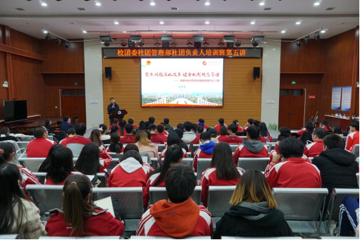 为提高学生社团负责人综合能力素质,扎实推进bat365学生社团全面、规范、健康发展,11月30日晚,校团委在就业指导中心多功能厅举办学生社团负责人培训班第五讲,全校各学生社团负责人和校团委社团管理部全体人员参加培训。