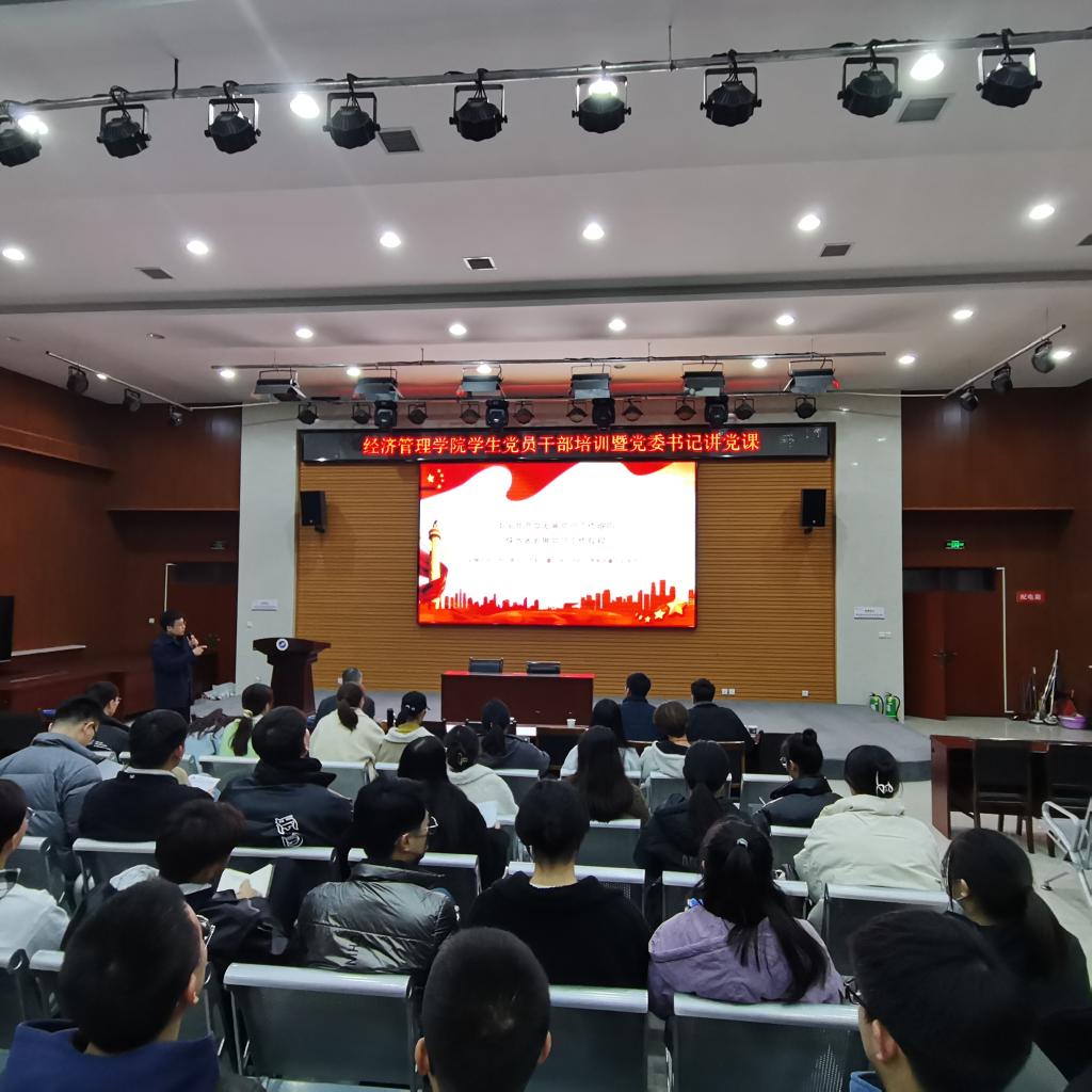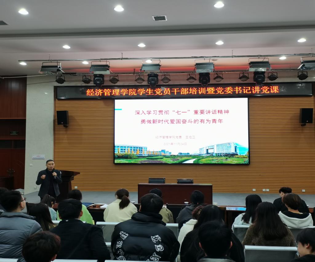为深入贯彻落实党的十九届六中全会精神和习近平总书记“七一”重要讲话精神,深刻领悟党的百年奋斗重大成就和历史经验,增强学生党员干部修养,增强学院党建工作实效,11月25日,经济管理学院在鄠邑校区崇文楼就业指导中心多功能厅举办“经济管理学院学生党员干部培训暨党委书记讲党课”专题活动。学院党委书记王宏卫、党委组织部组织科科长赵纪飞出席本次活动,学生工作办公室主任李博文,辅导员王业林,鄠邑校区学生党支部书记、委员及学生党建工作办公室全体成员参加本次培训活动。