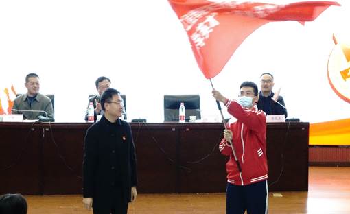 校团委书记何国强向学员代表授班旗,这标志着班级有着共同的价值认同,将旗帜举过头顶,将责任担在肩上。