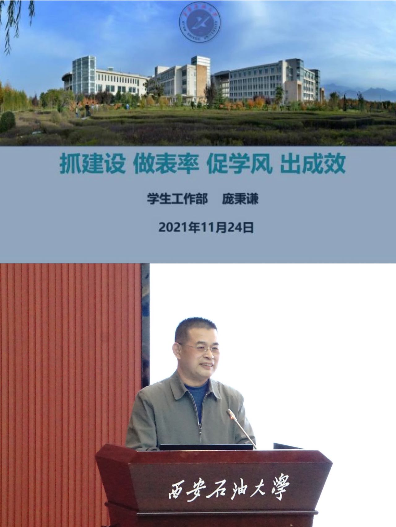随后,校学工部副部长庞秉谦为全体学员做了题为《抓建设 做表率 促学风 出成效》的开班第一讲。庞秉谦副部长分别从加强班级建设的重要性和必要性;如何做好班级建设工作;如何做一名优秀的班级学生干部三个方面向全体学员做了高站位、高质量的专题理论教学。尤其是在如何做一名优秀的班级学生干部方面,庞秉谦副部长更是结合自己的学生工作经验和学生干部经历,深入浅出地引导学员们要把准学生干部的身份定位、正确处理学生干部的五个关系等方面做好具体工作,促进班级建设。最后他说道:“大家一定要传承地科院的优良学风,认真学习,不断完善自己,争做一名优秀的学生、一名优秀的学生干部,做好班级建设相关工作。”