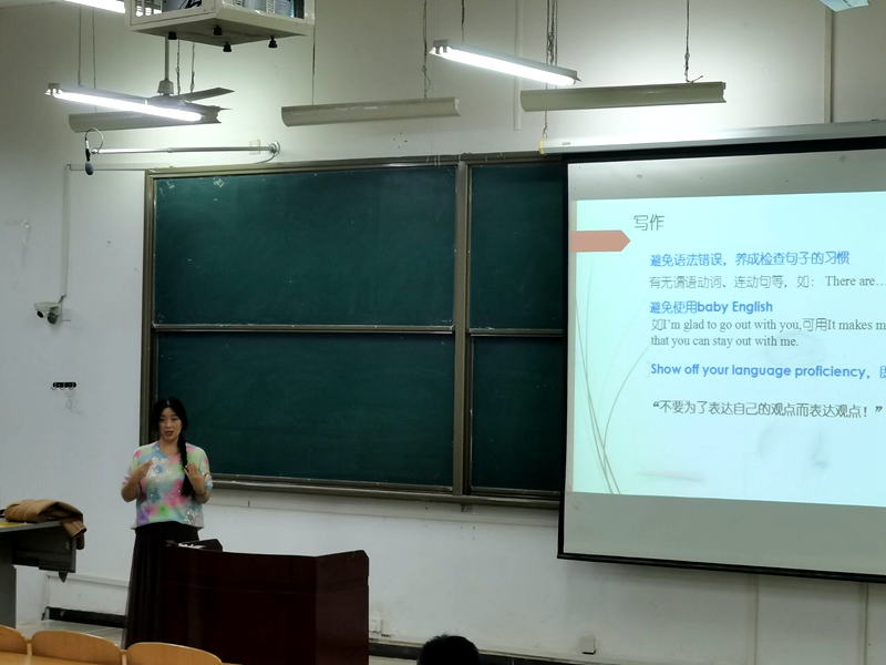 毕莹老师以“知己知彼,此战不殆——四级考试题型介绍及应考思路”为题,分别从考试流程、注意事项、写作翻译、应试技巧、重点语法等五个方面对CET-4考试作了介绍,系统地分析了四级考试流程及注意事项,全面总结了四级考试题型以及应答技巧,让学生对于CET-4考试有了一个基础性的认识。