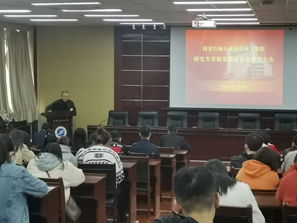 10月25日下午,化学化工学院研究生实验室稳定安全工作会议,在雁塔校区西阶第五会议室召开。学院党委书记司马文龙、科研副院长李善建、学院实验室管理老师、研究生工作相关负责老师出席会议,学院雁塔校区研究生参加了会议,会议由副院长李善建主持。