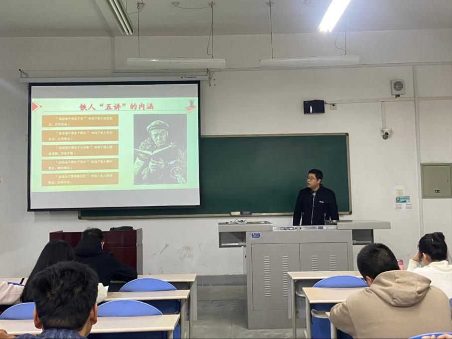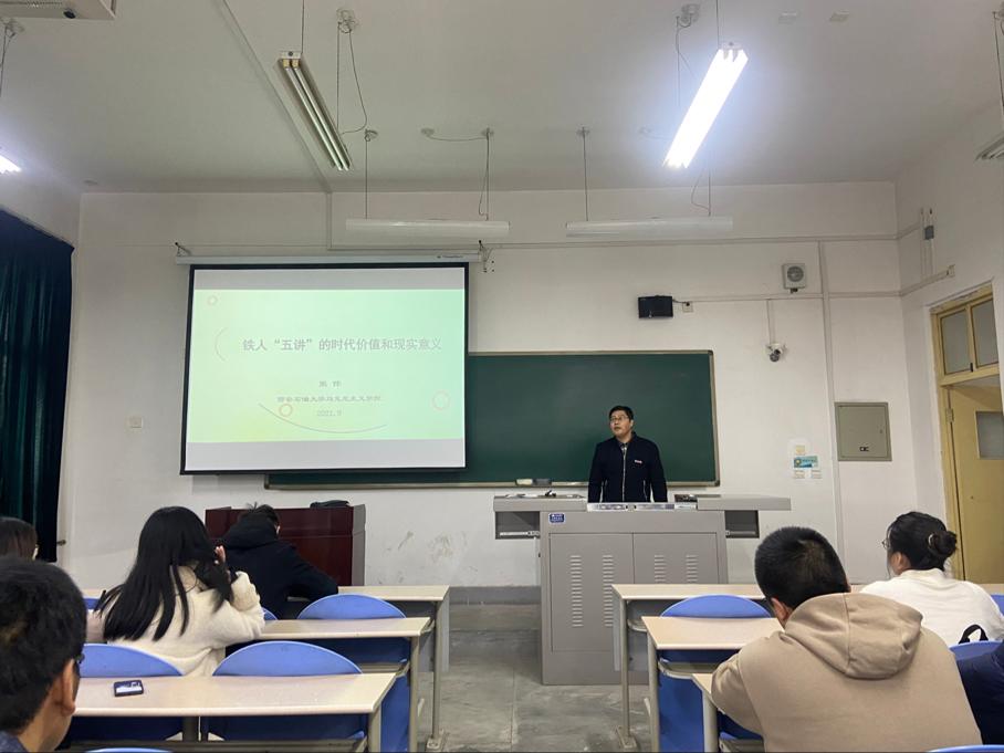 马克思主义学院党总支书记张伟为同学们讲授了《铁人“五讲”的时代价值和现实意义》专题讲座。张书记主要从铁人“五讲”的来历、内涵及时代价值和现实意义出发,为大家生动解读了铁人王进喜“讲进步不要忘了党、讲本领不要忘了群众、讲成绩不要忘了大多数、讲缺点不要忘了自己、讲现在不要割断历史”。“铁人五讲”反应了铁人王进喜看待成长进步、对待人民群众、对待荣誉地位、对待批评与自我批评,如何处理过去、现在的关系等观点朴素的哲学观点。对同学们理解铁人精神的丰富内涵、社会影响及当代价值提供了一把钥匙。其次,张书记明确指出不管是过去、现在、还是将来,铁人“五讲”都永不过时,对于我们每个人都有现实指导意义。铁人精神时刻提醒着我们,马克思主义的理论旗帜、中国特色的社会主义道路、全心全意为人民服务的宗旨就是我们共产党人的精神支柱。最后,他号召同学们向铁人学习,充分利用好红色资源、发扬好红色传统、传承好红色基因,成为德智体美劳全面发展的社会主义合格建设者和可靠接班人。