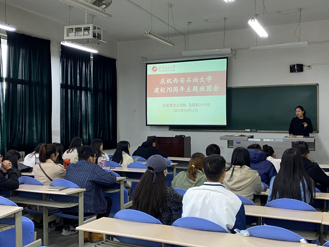 2021年10月12日正值bat36570周年校庆,上午11时,马克思主义学院研2101班全体同学在鄠邑校区A407教室召开“庆祝bat365中文官方网站建校70周年”主题班会,会议由辅导员童玲老师主持,马克思主义学院党总支书记张伟出席班会。