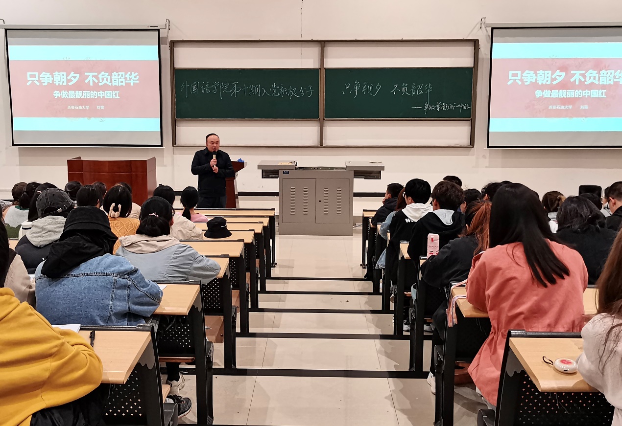 刘笛副部长以 “只争朝夕、不负韶华——争做最靓丽的中国红”为题,围绕习近平总书记重要讲话精神和重要回信精神,结合自己多年学生工作经验和工作实际,从“学思想、端动机,勤思考、善学习,提格局、勇担当,有情怀、立大志”四个方面进行讲授。他强调,大家要端正入党动机,树立正确的世界观、人生观、价值观,坚持为同学服务、为班级做贡献、为学校争荣誉、为国家富强而努力、为中华崛起而读书;要以英语、翻译和俄语的专业培养要求为纲,不断提升自己的专业能力、学业水平,切实成为国家需要的外语人才;要以党员的标准要求来要求自己,学好本领,勇担历史使命,发挥模范带头作用。并对全体学员提出了四点希望,一是要陶冶情操,勤学修德;求真向善,诚信友爱。二是要主动学习,勤学善思;创新学习,积极实践。三是要坚定信念,正确定位;不忘初心,勇担责任。四是要但行好事,初心莫忘;前途似海,未来可期。