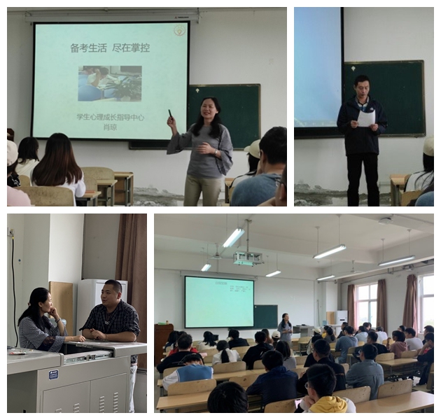 接下来,肖琼教授为在场学生作了 “备考生活,尽在掌控”为主题的心理讲座。肖老师以“备考过程中遇到的十个问题”为切入点,引导大家进行自我评估,同时通过运用大量的数据和丰富的实例,详细讲解了备考过程中不同的压力来源、影响情绪的因素和考研的趋避冲突,分析了备考阶段可能出现的心理问题和焦虑与学习表现的关系。根据备考学生特点,提出了有效缓解压力、克服焦虑情绪的具体方法。讲座过程中,肖老师还带领大家做了一些简单的互动游戏(正念冥想、腹式呼吸等),帮助大家调整情绪,缓解压力。最后,肖老师建议大家在复习备考过程中要敞开胸怀、善于交流、敢于倾诉、适当宣泄,走出“考前综合症”,以最佳的状态面对考试。