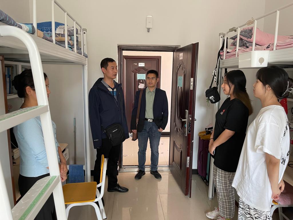 学院党委副书记张云姿带队对学生宿舍进行走访与安全检查。走访检查期间,张副书记详细询问了同学们开学以来的生活和学习情况,希望同学们和睦相处,共同营造文明友爱、干净卫生、安全有序的宿舍生活环境;提醒同学们要自觉遵守学校宿舍管理规章制度,要求同学们积极配合学校开展的各项安全检查工作,牢固树立安全意识,养成良好的行为习惯;叮嘱同学们在“十一”假期要注意安全,严格遵守疫情防控规定,留校的同学要多与家人联系,利用假期积极充实和提高自己。