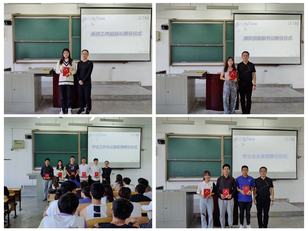 焦老师首先介绍了学生工作办公室、系团委、学生会、易班工作站的概况,肯定了上一届学生干部的工作成绩,感谢他们为体育系发展付出的努力,并宣布2021年的聘任名单。随后,侯老师、焦老师分别为学生工作办公室助理、系团委兼职副书记、学生会主席团成员、易班工作站站长颁发聘书。焦老师叮嘱学生干部要主动帮助同学、服务同学,要注意处理学习与工作的关系,积极开展班级建设,大学英语四级备考、考研就业等工作,主动带动班风、学风良好发展,也希望其他同学能够积极配合、尽力协助学生干部一同丰富同学们的校园文化生活。