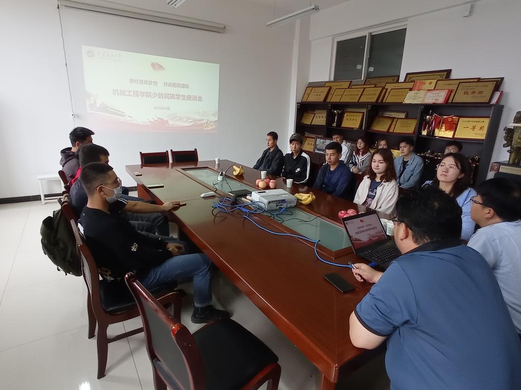 今年是建党百年的辉煌时刻,又时值新中国成立七十二周年,为全面贯彻落实习近平总书记“七一”重要讲话精神、在中央民族工作会议上的重要讲话精神和在第三次中央新疆工作座谈会上的重要讲话精神,加强学院对少数民族学生的思想政治引领和学习生活关心,9月27日中午,机械工程学院在鄠邑校区天工楼431会议室召开2021年新疆少数民族学生座谈会,宣讲党的民族政策,传达学校、学院对少数民族学生的关怀。学院党委副书记刘冰、全体学工干部、19名新疆少数民族学生参加,座谈会由学生工作办公室主任文爱国主持。