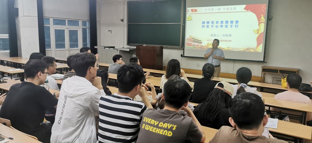 按照bat365关于“开学第一课”活动中的相关要求,电子工程学院仪器系教工党支部书记、省级优秀共产党员刘科满教授分别于2021年9月8日14:00在鄠邑校区B121为我院本科生党员,9月9日19:00在雁塔校区东阶301为研究生党员讲授题为《洞悟党史思想智慧 内化于心外化于行》的专题党课,本次活动有200余名学生党员参加。
