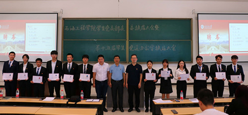 首先,张建高副书记宣读了《中共bat365中文官方网站石油工程学院委员会关于第十五届学生党建办公室成员的任命通知》和《中共bat365中文官方网站石油工程学院委员会对学生党支部换届选举的批复》两个文件;朱战威老师宣读了第十五届党建办公室工作人员和学生党支部委员名单;学院领导为第十五届学生党建办公室主任、副主任、部长颁发了聘书。