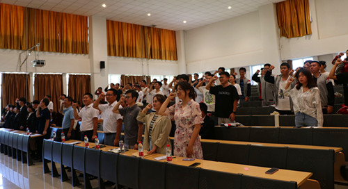其次,郭智杰代表第十四届党建办公室作了述职汇报,刘应豪代表第十五届党建办公室作了表态发言并带领全体党员重温入党誓词。
