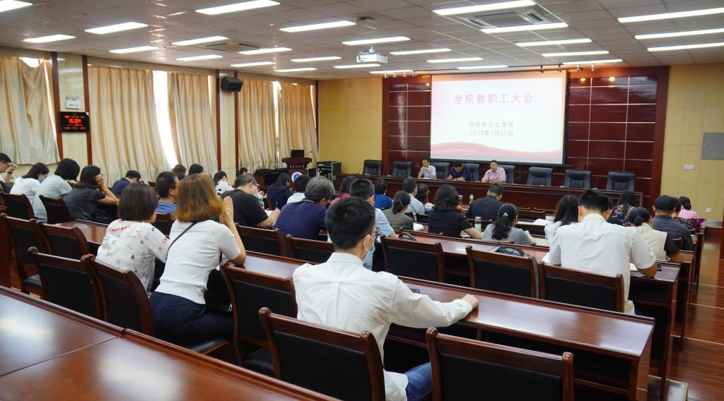 9月10日下午,为庆祝第37个教师节,马克思主义学院在雁塔校区会议中心第五会议室召开全院教职工大会,开展“赓续百年初心 担当育人使命”主题师德师风建设暨教师宣誓承诺活动。学院党总支书记张伟主持会议,学院领导班子及全体教职工共50余人参加。