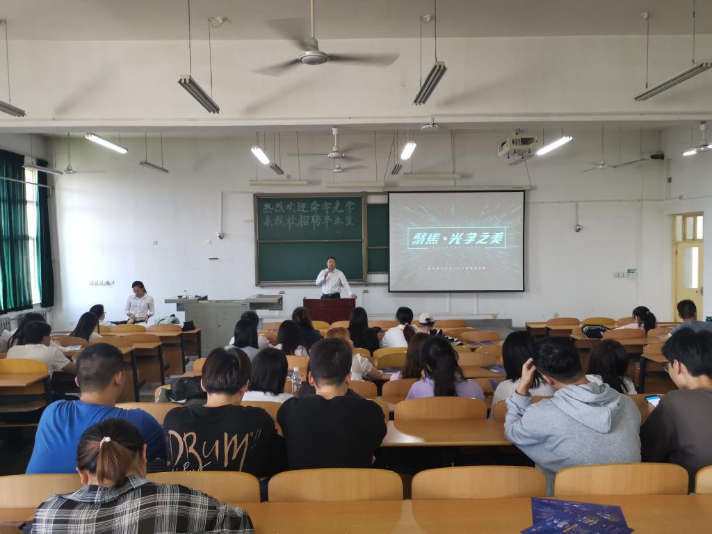 9月9日,理学院在鄠邑校区召开宁波舜宇光学公司专场招聘会,按照疫情防控要求,本次招聘会先后在教学B区325教室及志远楼502教室召开。理学院党委副书记马小刚主持并发言,舜宇光学招聘领导凌经理、何经理主讲,理学院学生工作办公室主任丁亦喆参加,全校共计180余名2022届本科及硕士毕业生参加本次招聘会。